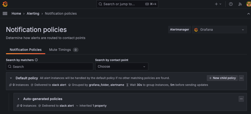 기본적으로 Grafana의 알림 전송 설정은 이메일로 되어 있습니다. 따라서, 이메일 대신 Slack으로 전송되도록 변경해줘야 합니다. 이를 위해, 왼쪽 메뉴에서 Home > Alerting > Contact points로 들어가서 이메일 전송을 Slack으로 변경합니다.