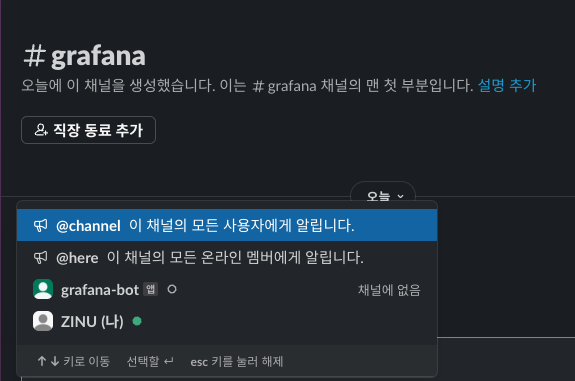 생성한 앱을 #grafana 채널에 Webhook을 설정해놨으니깐, 추가를 해줍니다.