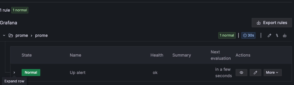 애플리케이션을 다시 실행하면 Grafana에서 상태가 다시 Normal로 변경되어 정상적으로 동작하고 있음을 확인할 수 있습니다.