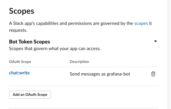 - chat:write: 스코프는 Slack 채널에 메시지를 전송할 수 있는 권한을 부여합니다.