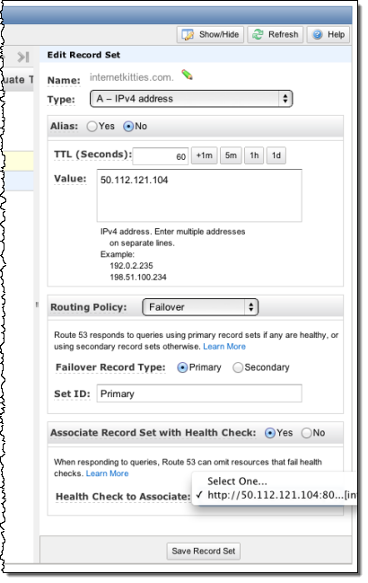 - TTL을 60초로 설정합니다. 이렇게 하면 이 DNS 레코드가 인터넷 DNS 시스템 내에서 캐시되는 시간이 제한됩니다. 즉, 장애 조치가 발생하는 시간과 최종 사용자가 백업 사이트로 라우팅되기 시작하는 시간 사이에 지연이 더 짧아집니다.