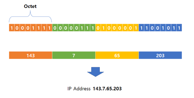 위 그림을 보면 알 수 있다. 실제로 IP 주소는 컴퓨터에 저장 될 때 비트 단위로 저장되어 있을 것이다. 그것을 옥텟 단위로 구분하여 10진수의 정수로 표현하고 각 옥텟사이를 마침표(.)로 구분해 주면 우리가 일상적으로 사용하는 IPv4 주소가 된다.
