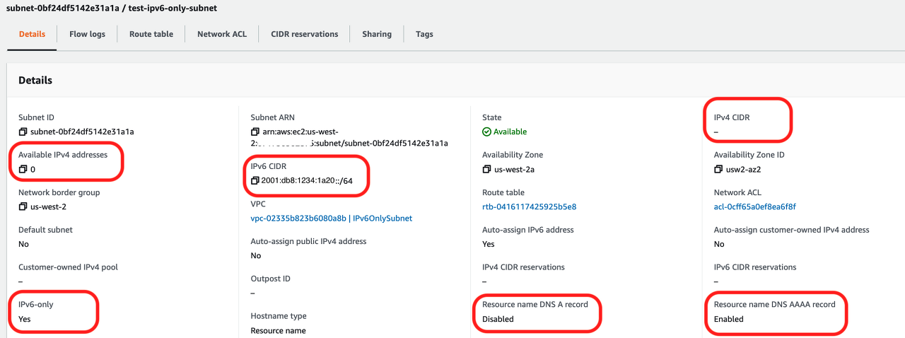 나중에 서브넷 ID가 필요하므로 지금 기록해 두십시오. 위의 그림 1에 사용된 IPv6 CIDR 2001:db8:1234:1a00::/56은 IANA가 예약한 문서 전용 접두사 2001:db8::/32에 속하며, 이는 문서화 목적으로만 사용됩니다. 귀하의 경우 AWS에서 제공한 IPv6 주소를 사용하거나 VPC에 대해 자체 IPv6 주소 가져오기 (BYOIPv6)를 사용할 수 있으므로 CIDR이 달라집니다. 이제 서브넷으로 이동하고 특정 서브넷을 선택하여 서브넷이 IPv6 전용인지 확인할 수 있습니다. 세부 정보 ( 아래 그림 2 참조)에서 다음 필드를 찾습니다.