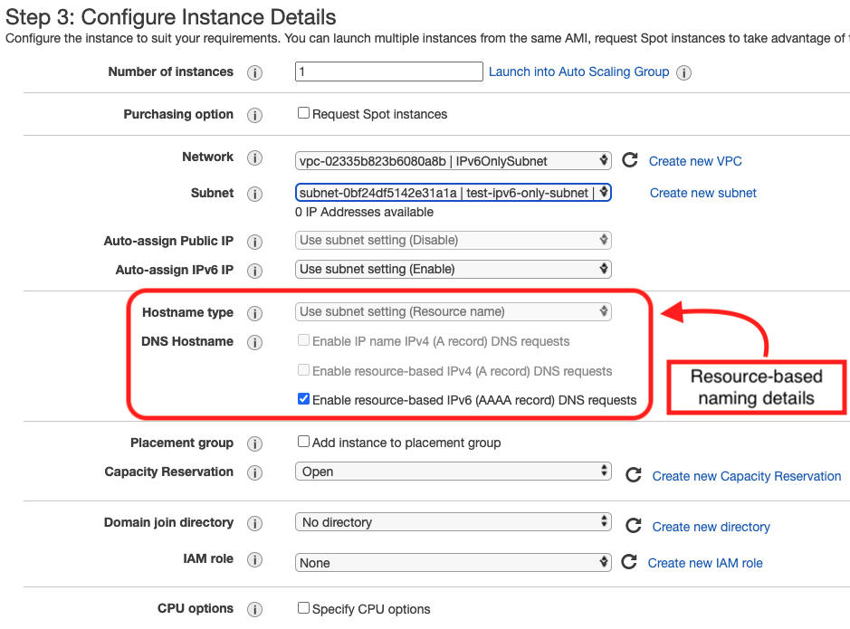 EC2 인스턴스를 IPv6 전용 서브넷으로 시작하면 리소스 기반 이름 지정이 자동으로 사용되며 아래 섹션에서 볼 수 있듯이 "리소스 기반 IPv6(AAAA 레코드) DNS 요청"이 활성화됩니다.