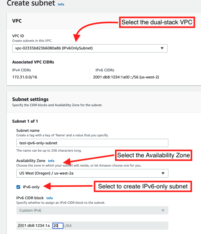 AWS Management 콘솔 또는 명령줄 인터페이스 (CLI) 를 사용하여 IPv6 전용 서브넷을 생성할 수 있습니다 . 이 블로그 게시물에서는 콘솔을 사용하여 이를 수행합니다.