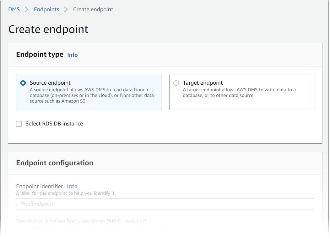 복제 인스턴스가 생성되는 동안 이전에 생성한 Amazon RDS 데이터베이스의 원본과 대상 데이터 스토어 엔드포인트를 지정할 수 있습니다. 각 엔드포인트를 별도로 생성합니다.