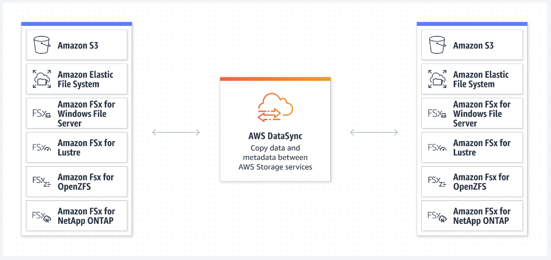 AWS DataSync는 온프레미스와 AWS 스토리지 서비스 사이에서 데이터 이동을 자동화 및 가속화하는 안전한 온라인 서비스다. DataSync는 Network File System(NFS) 공유, Server Message Block(SMB) 공유, Hadoop 분산 파일 시스템(HDFS), 자체 관리형 객체 스토리지, AWS Snowcone, Amazon Simple Storage Service(S3) 버킷, Amazon Elastic File System(Amazon EFS) 파일 시스템, Amazon FSx for Windows File Server 파일 시스템, Amazon FSx for Lustre 파일 시스템 및 Amazon FSx OpenZFS 파일 시스템 및 Amazon FSx for NetApp ONTAP 파일 시스템 간에 데이터를 복사할 수 있다.