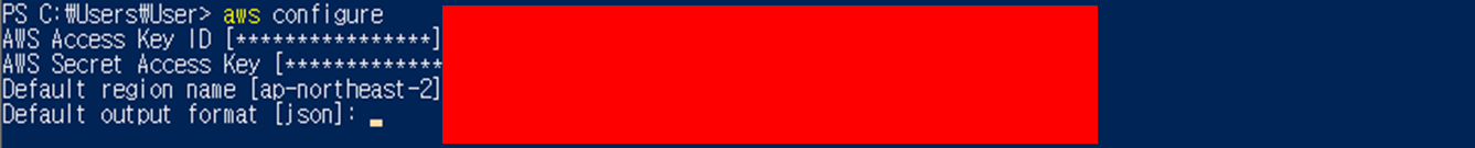 4. aws configure를 클릭해 자신이 만든 S3 full access 계정의 accesskey와 secret accesskey를 입력하고 region은 자신 region을 선택 마지막은 그냥 엔터를 누르면 된다.