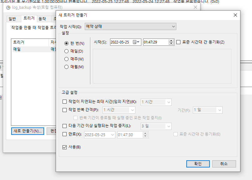 새 트리거 만들기를 클릭한 후 자신이 원하는 설정을 작성한다 만약 한시간씩 매일 백업을 받고 싶다면 매일 클릭 원하는 시간 클릭, 작업 반복 간격 1시간 기간을 무한대로 하면 취소하기 전까지 무한대로 매일 24개의 백업을 S3로 올릴 수 있다.