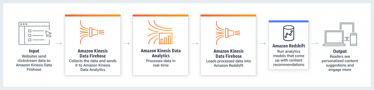기업은 수많은 웹사이트에서 조직화된 클릭스트림 데이터를 수집하고 일괄 처리를 사용하여 분석합니다. 회사는 매일 약 1KB 크기의 이벤트 레코드 1억 개를 받습니다. 매일 밤 조직은 비즈니스 분석가가 수집하는 Amazon Redshift로 데이터를 가져옵니다.