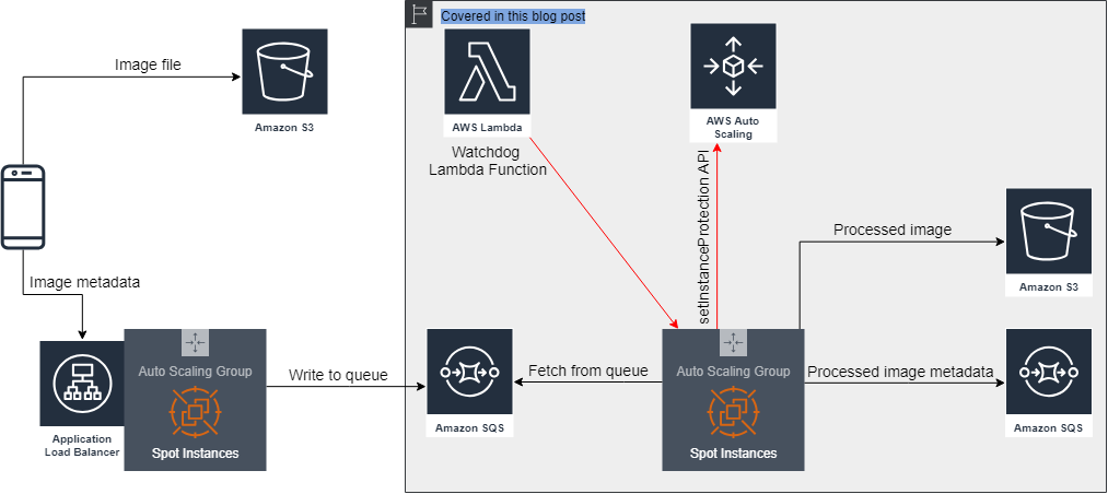 애플리케이션은 스팟 인스턴스 중단의 영향을 최소화할 수 있습니다. 이를 위해 애플리케이션은 2분 간의 중단 알림( 인스턴스의 메타데이터에서 사용 가능 )을 포착하고 대기열에서 작업 가져오기를 중지하도록 지시합니다. 2분이 만료되고 인스턴스가 종료될 때 아직 처리 중인 이미지가 있는 경우 애플리케이션은 프로세스가 완료된 후 대기열에서 메시지를 삭제하지 않습니다. 대신 Amazon SQS 가시성 제한 시간 이 만료 된 후 다른 인스턴스가 선택하고 처리할 수 있도록 메시지가 다시 표시 됩니다.