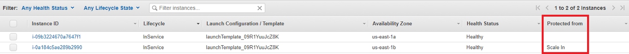 솔루션이 작동하는지 확인하려면 CloudFormation 템플릿을 배포하세요. 그런 다음 Amazon S3 버킷에 이미지를 업로드합니다. Auto Scaling Groups 콘솔의 Instances 탭에서 인스턴스 보호 상태를 확인합니다. 보호 상태는 다음 스크린샷에 표시됩니다.