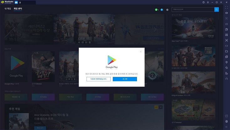 저는 블루스택4 전용 지메일 아이디를 만들어서 로그인했습니다.