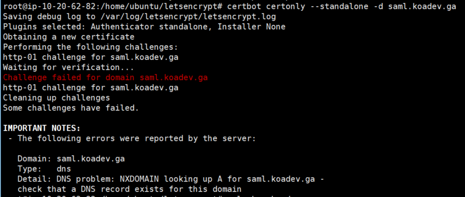 root@ip-10-20-62-82:/home/ubuntu/letsencrypt# certbot certonly --standalone -d saml.koadev.ga