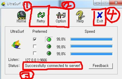울트라 서프는 가장 대중적인 아이피 변경 프로그램인데요. 간단한 사용방법이 장점입니다. 다운로드 받고 설치하기만하면 자동으로 알아서 successfully 즉, 연결이 완료되었다고 뜨게됩니다. 가장 간단한 아이피 변경 프로그램이라고 할수있는데요. 간단한것이 장점인 반면 다소 느린 속도가 단점입니다.
