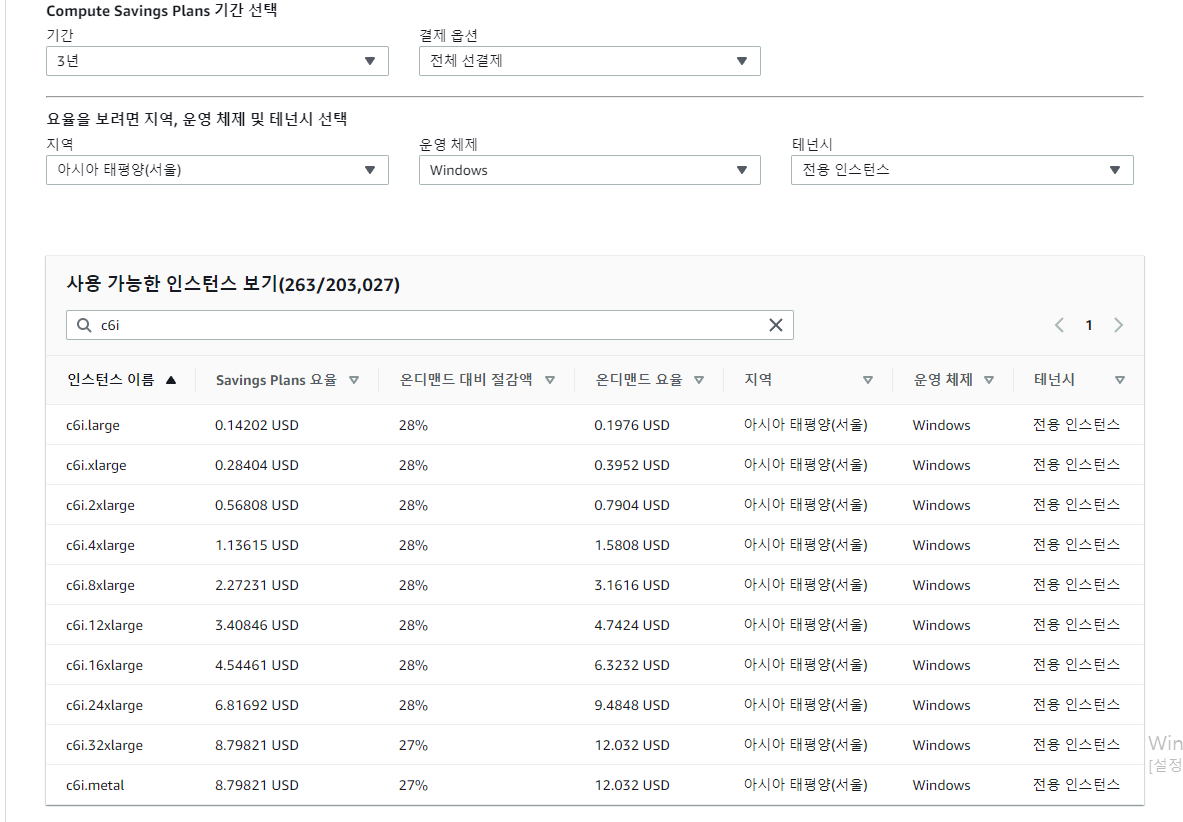 Savings Plans에 적용 가능한 요금은 https://aws.amazon.com/ko/savingsplans/compute-pricing/ 에서 확인이 가능하다.