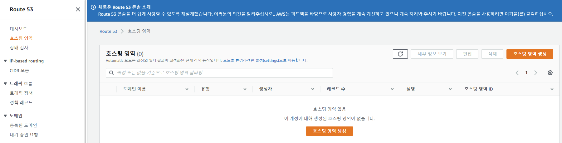 먼저 Route53에 들어온 후 호스팅 영역 생성을 클릭한다.