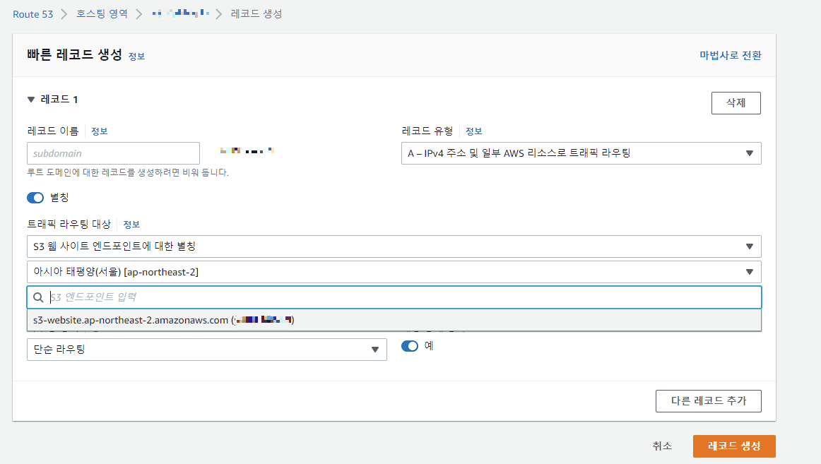 레코드 이름을 S3 버킷이랑 똑같이 생성하지 않으면 트래픽 라우팅 대상에 S3 엔드포인트 이름이 뜨지 않는다.