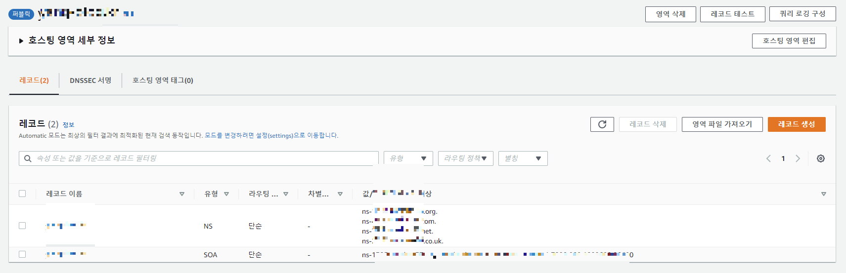 나는 호스팅 이름을 버킷, 그리고 호스팅 KR에서 선택한 도메인 이름과 동일하게 설정한 후 호스팅 영역을 생성 했다. 이름은 무조건 동일하게 생성해야 한다.