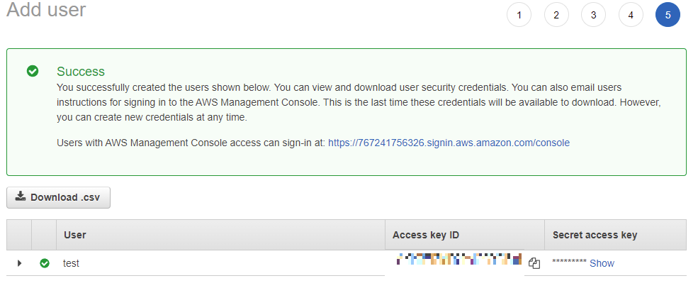 생성한 user에 대한 정보인데, 여기서 Access key ID와 Secret access key는 추후에 꼭 필요하니 메모장에 적어 두도록 하자. 추가로 해당 계정에 대한 csv 파일도 다운받아 저장해 두자.