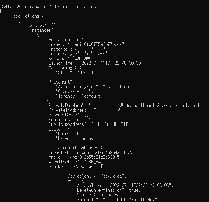 aws ec2 describe-instances 명령어를 입력하면 인스턴스의 목록이 아래와 같이 확인되는데,