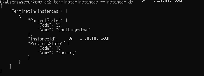 아래와 같이 aws ec2 terminate-instances --instance-ids 뒤에 인스턴스 ID를 입력하면 종료 명령어가 실행된다.