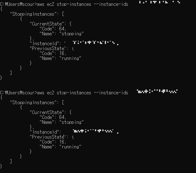 추가로 인스턴스 중지의 경우는 aws ec2 stop-instances --instance-ids 뒤에 인스턴스 ID를 입력하면 중지된다.
