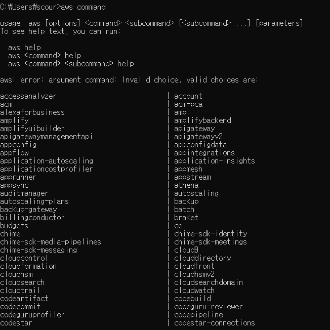 CMD창에서 AWS Command를 입력하면 뭐 Error이기 때문에 해당 Line을 출력하는것이긴 하지만, AWS CLI를 이용하여 사용 가능한 명령어들의 목록이 나열된다.