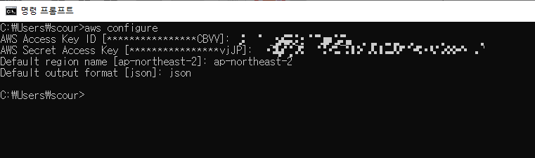 다음으로는 cmd창을 실행하여 AWS CLI에 해당 계정으로 설정을 한다.