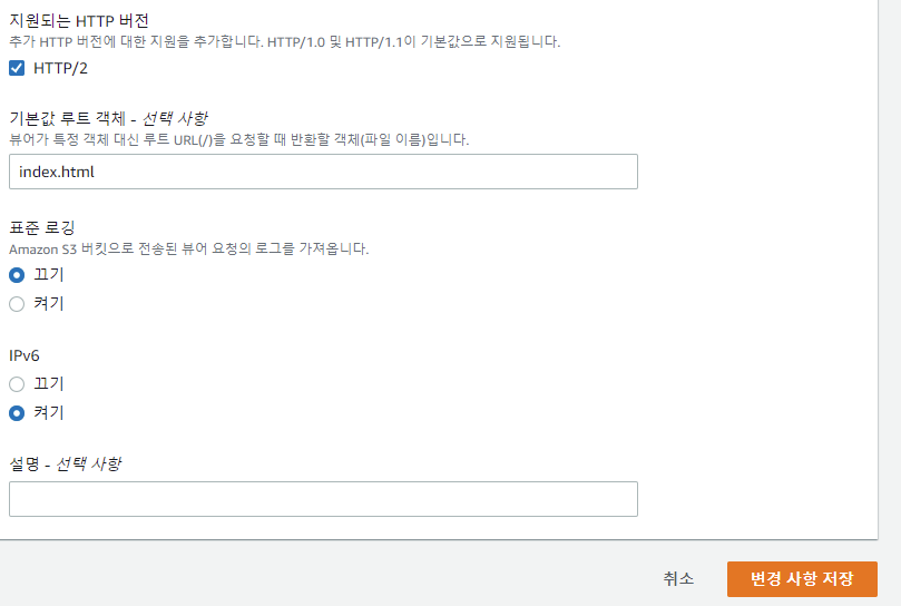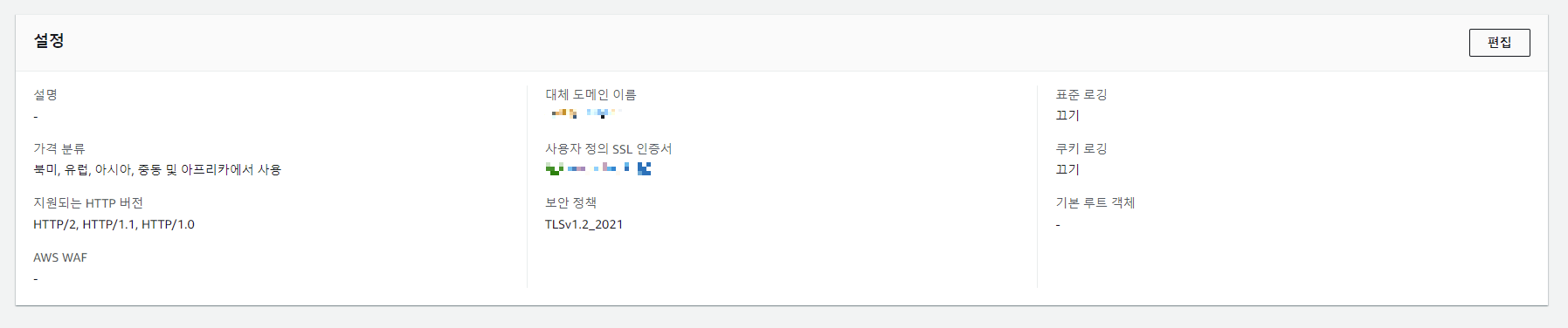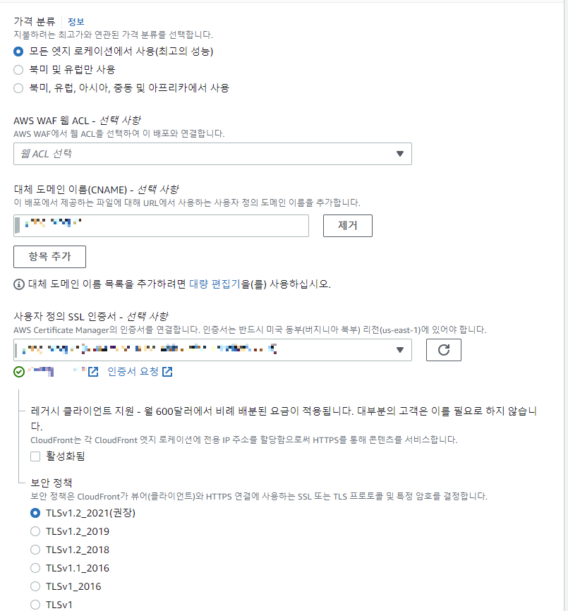 가격 분류를 나는 모든 엣지 로케이션으로 선택했지만 사실 자신이 서비스할 국가에 해당하는 엣지 로케이션을 하는 것이 금액적으로 절감이 된다. 그 이후 대체 도메인 이름을 내 S3 버킷과 똑같이 해야한다.