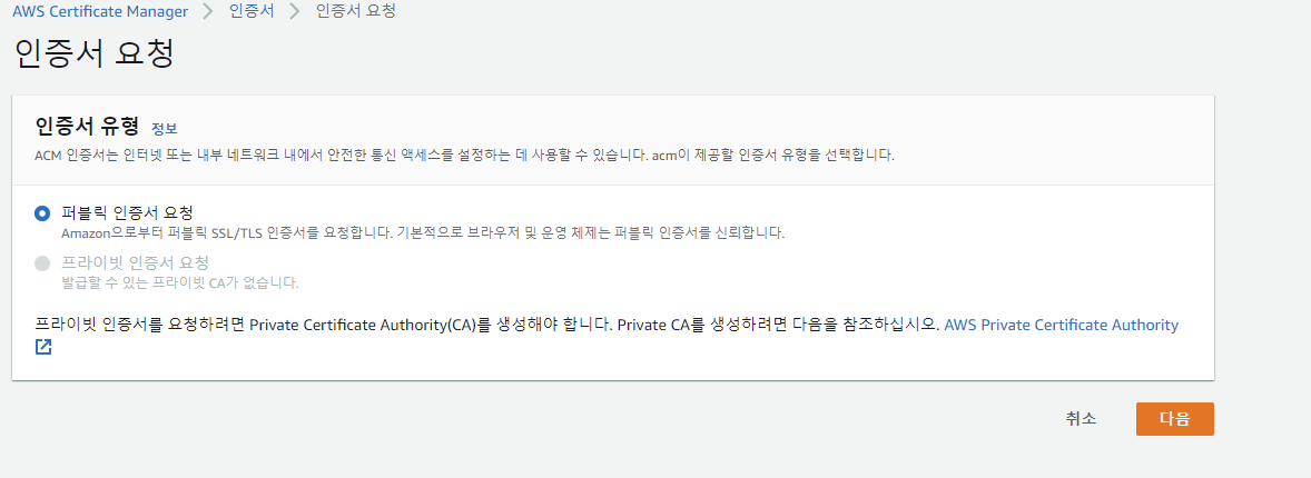 먼저 인증서 유형을 퍼블릭으로 요청한 후 다음을 누른다.