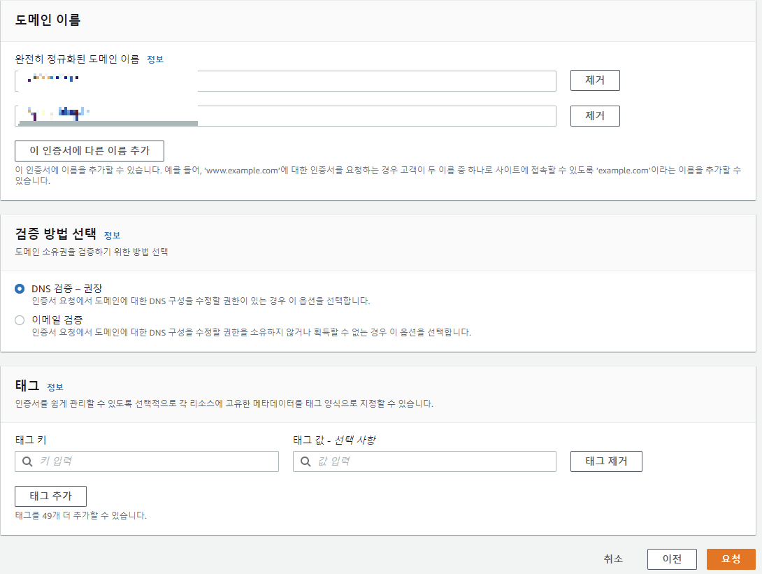 그 다음 자신이 생성했던 Route 53, S3 버킷 이름과 동일하게 도메인 이름을 작성해야 한다. 그 이후 요청을 누른다.