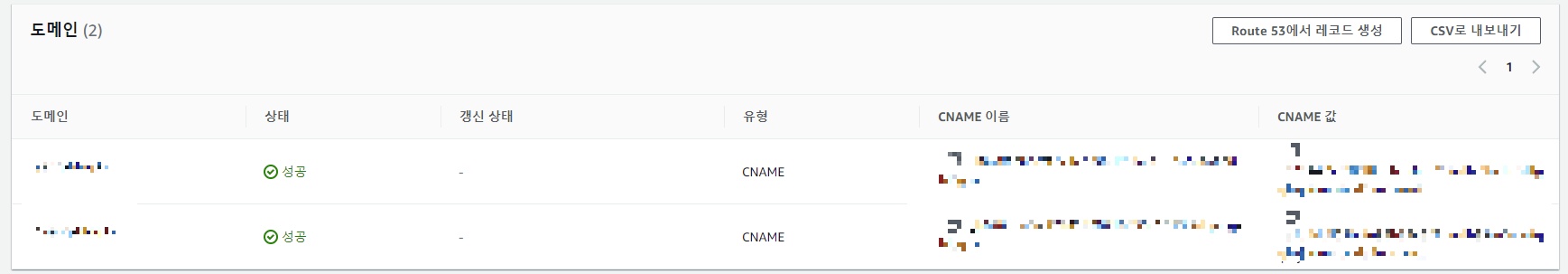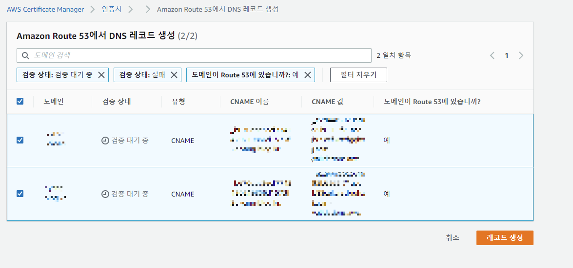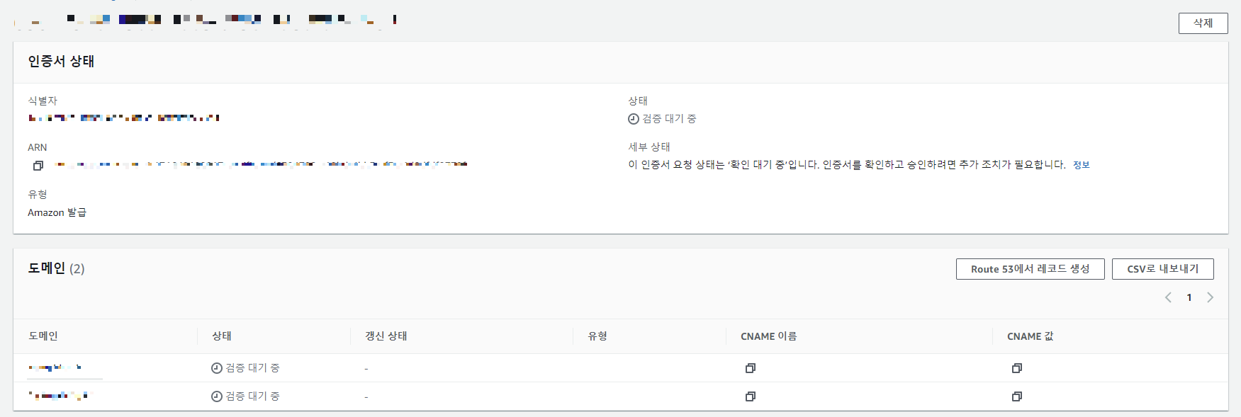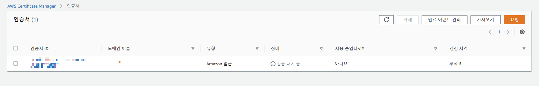 생성된 인증서를 클릭해보면 도메인이 검증 대기중이라고 뜬다.