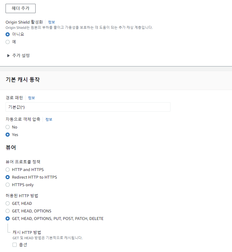 그 이후 Origin Shield는 기본값인 아니요로 놔둔다. 경로 패턴, 자동으로 객체 압축을 모두 기본 값으로 유지한다.