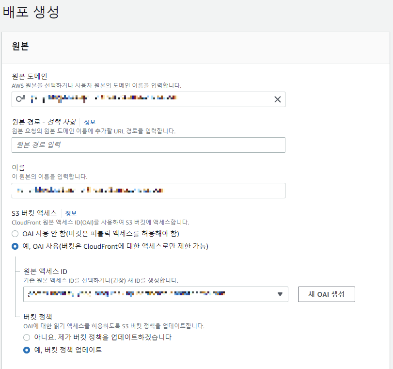 그 다음 S3 버킷 액세스를 OAI 사용으로 해야한다. 그렇지 않으면 버킷을 CloudFront를 거치지 않고도 접근이 가능하므로 우리가 설계하려고 하는 구성에 어긋난다. 그 이후 새 OAI 생성을 누르면 정책이 생긴다.