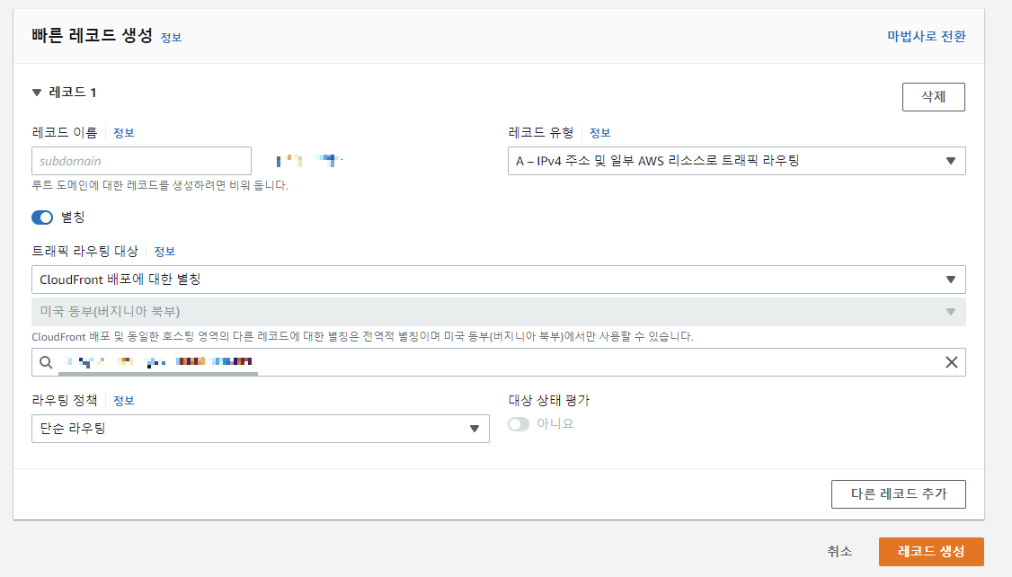 그 다음 Route53에서 S3 레코드를 생성했던 것처럼 진행하면서 트래픽 라우팅 대상만 CloudFront로 바꿔주면 된다.