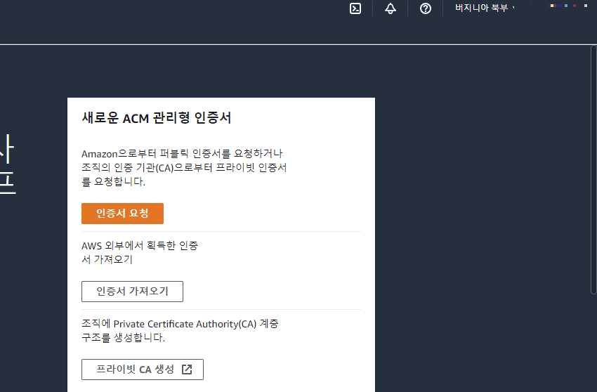 먼저 ACM에서 SSL 인증서를 생성할 것이다. 우리는 HTTP 뿐만 아니라 HTTPS로도 연결을 허용할 것이므로 그러기 위해서 인증서가 필요하다.