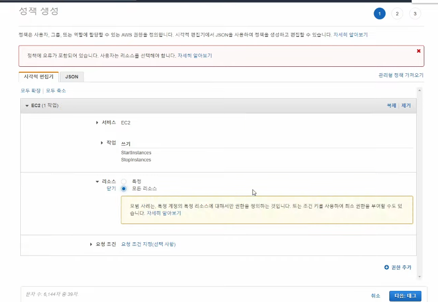 정책생성에서 우리는 EC2에 대한 정책이 필요하므로 서비스는 EC2를 선택해준 후 작업을 선택해 준다. 작업의 개수가 많은데 우리는 인스턴스의 시작과 중지에 대한 작업을 사용할 것이기 때문에 두가지를 선택한 후 리소스는 모든 리소스를 선택한 후 태그를 작성하고 생성해 준다.