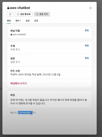 채널의 이름을 작성한 후 Cloud Watch Logs에 로그 게시를 할 지 선택해주면 된다. 선택사항이므로 안해도 괜찮다. 그 후 Slack 채널에서 퍼블릭과 프라이빗을 통해서 채널 유형을 설정해준 후 자신이 속한 슬랙 채널의 채널 ID를 입력한다.
