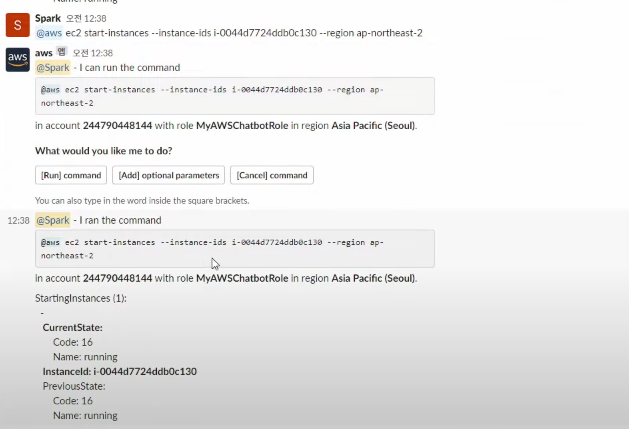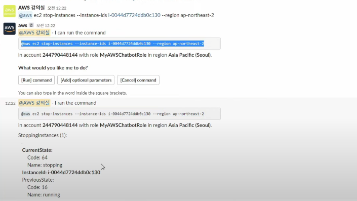 그 이후 슬랙에 들어가서 인스턴스를 정지하는 CLI 명령어를 작성한다. 작성해서 엔터를 누르면 한번 더 이 명령을 실행 할 것인지 아니면 파라미터를 추가할 것인지 아니면 명령을 취소할 것인지에 대해서 물어본다. 이 가드레일을 통해서 명령어를 입력하더라도 한번 더 확인 후 안전하고 꼼꼼한 작업이 가능하다.