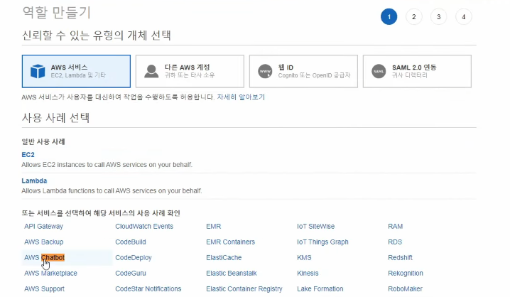 IAM에 들어가서 역할 생성을 클릭한 후 사용 사례 선택에서 AWS Chatbot을 찾아서 선택해 준다.