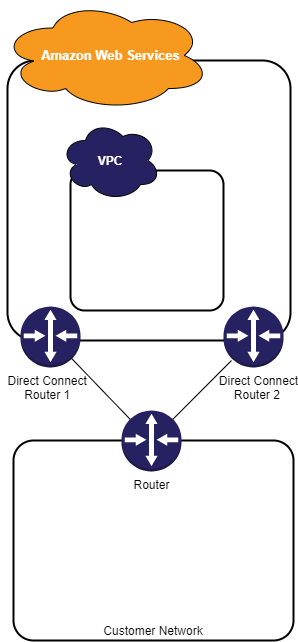 장애 조치로, 2개의 전용 연결을 요청하고 구성하는 것이 좋습니다.AWS다음 그림에 나와 있습니다. 이러한 연결은 네트워크에 있는 한 두개의 라우터에서 종료될 수 있습니다.