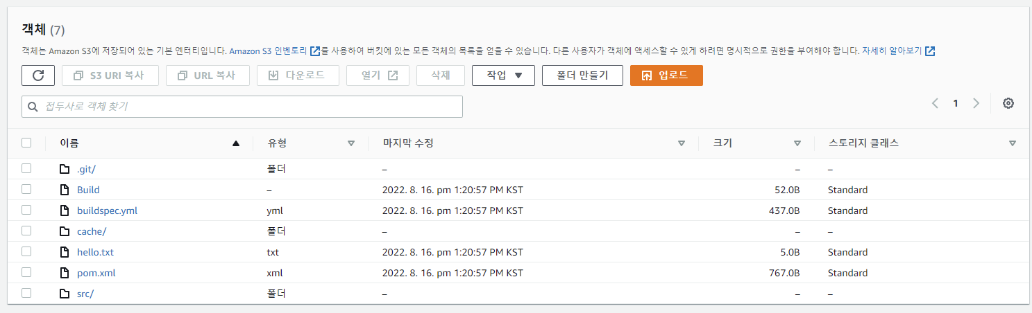이 S3 객체를 보면 cache라는 폴더가 존재하는데 이는 CodeBuild를 생성할 때 로그를 S3에 남기기 위해 설정을 했기 때문에 남았다.
