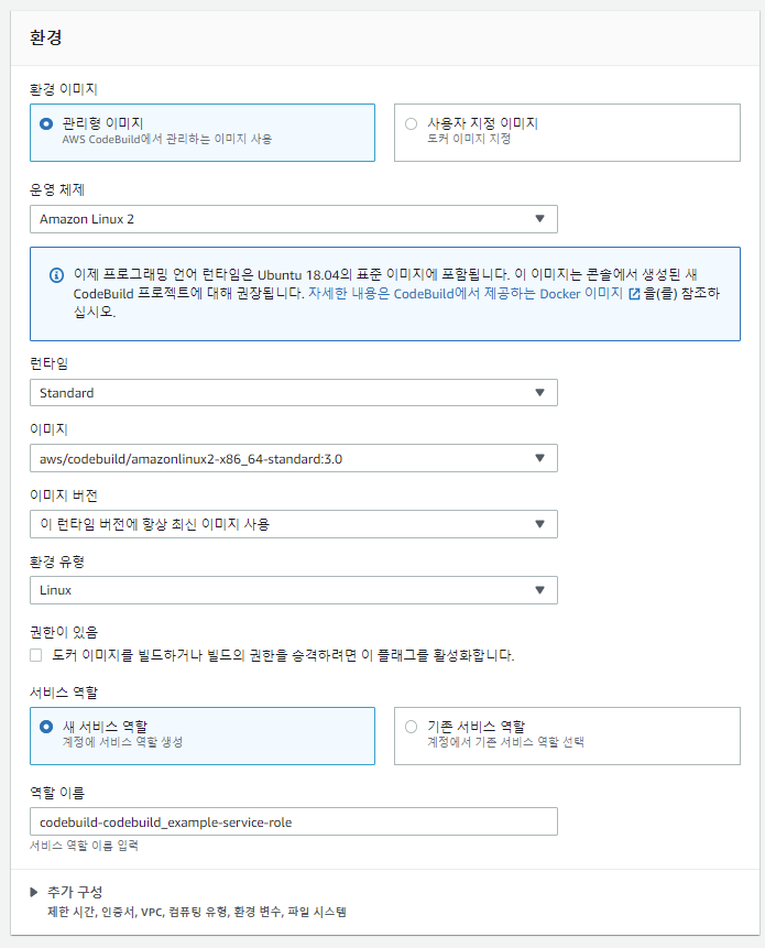 그 이후는 환경 구성이다. 이는 CodeBuild를 호출하여 빌드를 실행할 때 빌드 환경에 대한 정보를 제공해야 하기 때문에 필요하다. 빌드 환경은 CodeBuild를 실행하는데 사용하는 운영체제, 프로그래밍 언어 런타임 및 도구의 조합을 나타냅니다.