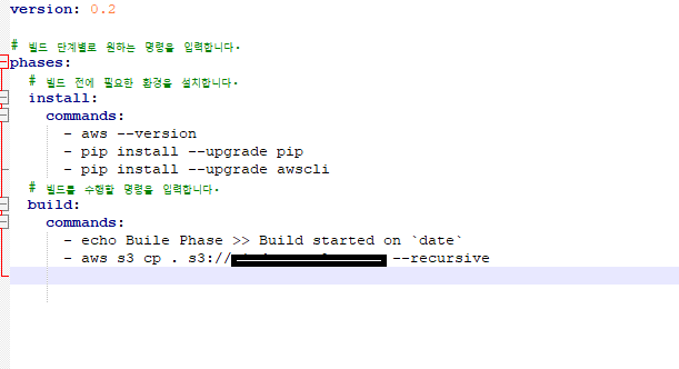 그러므로 buildspec.yml에 작성할 스크립트는 내 Codecommit에 있는 파일을 S3로 옮기는 것이다.