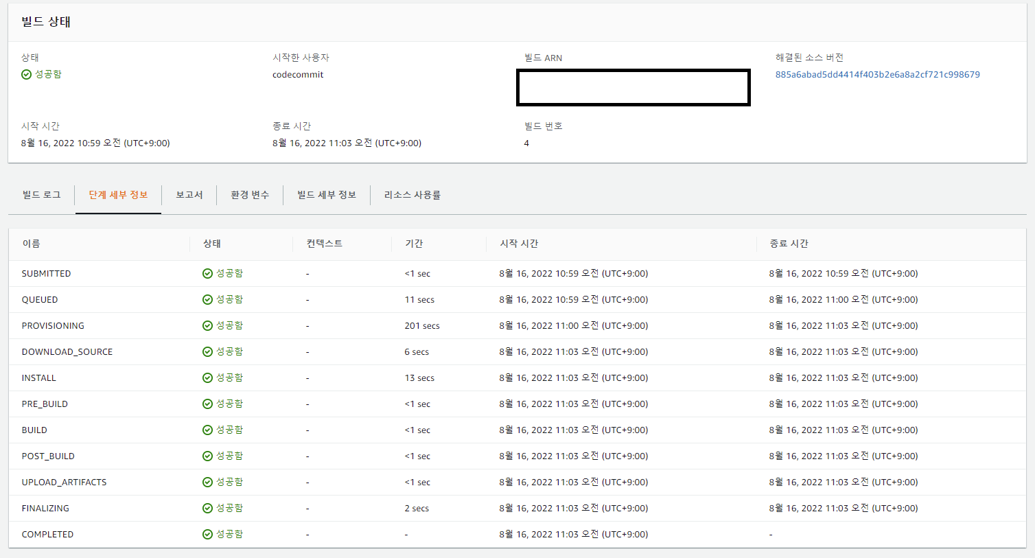그럼 이런식으로 단계 세부정보가 뜨면서 성공했는지 실패했는지 여부에 대한 기록이 뜨게 된다.