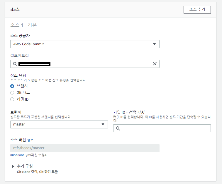 소스는 CodeCommit Git, 등을 선택할 수 있다.