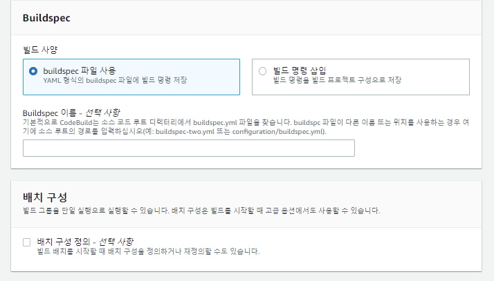 그 이후 Buildspec은 buildspec 파일 사용으로 놔두었다.