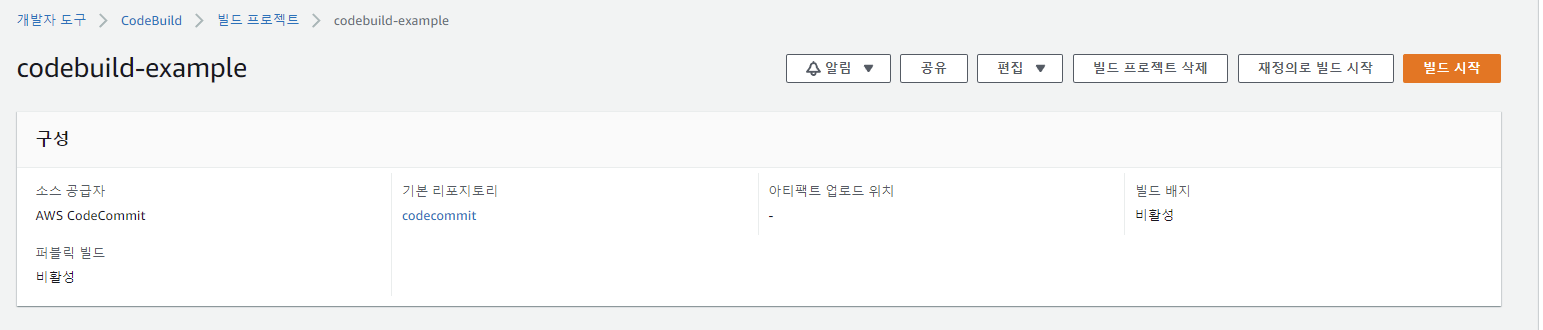 그 이후 다시 CodeBuild로 돌아와 빌드 시작을 눌렀다.