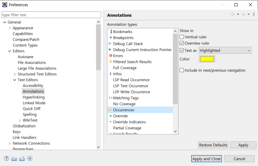 General - Editors - Text Editoros - Annotations를 선택하고, Annotation types에서 occurrences의 색상을 변경하면된다.